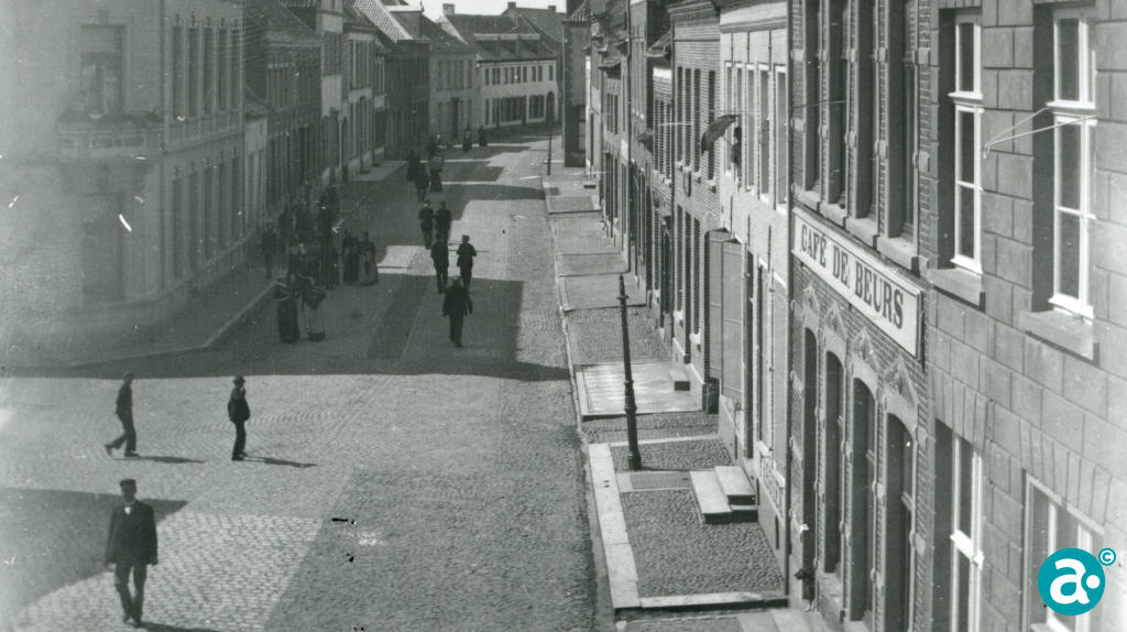 Het pand links naast café de Beurs was van de familie Kneepkens-Esser en kreeg in 1899 een nieuw voorgevel de foto is dus gemaakt voor 1899.